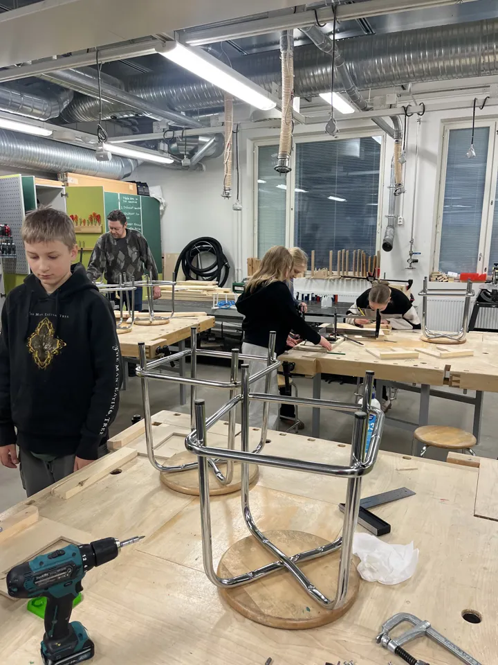 Les élèves peuvent s'asseoir à leur pupitre, à une table, au sol, sur un coussin, etc. Nous avons également vu des classes qui sont conçues pour que les élèves puissent bouger grâce à des espaliers, des ballons de yoga, des tabourets oscillants. Dans ces classes, des activités physiques prévues à même un cours de langue finnoise où les élèves devaient simultanément construire des phrases.